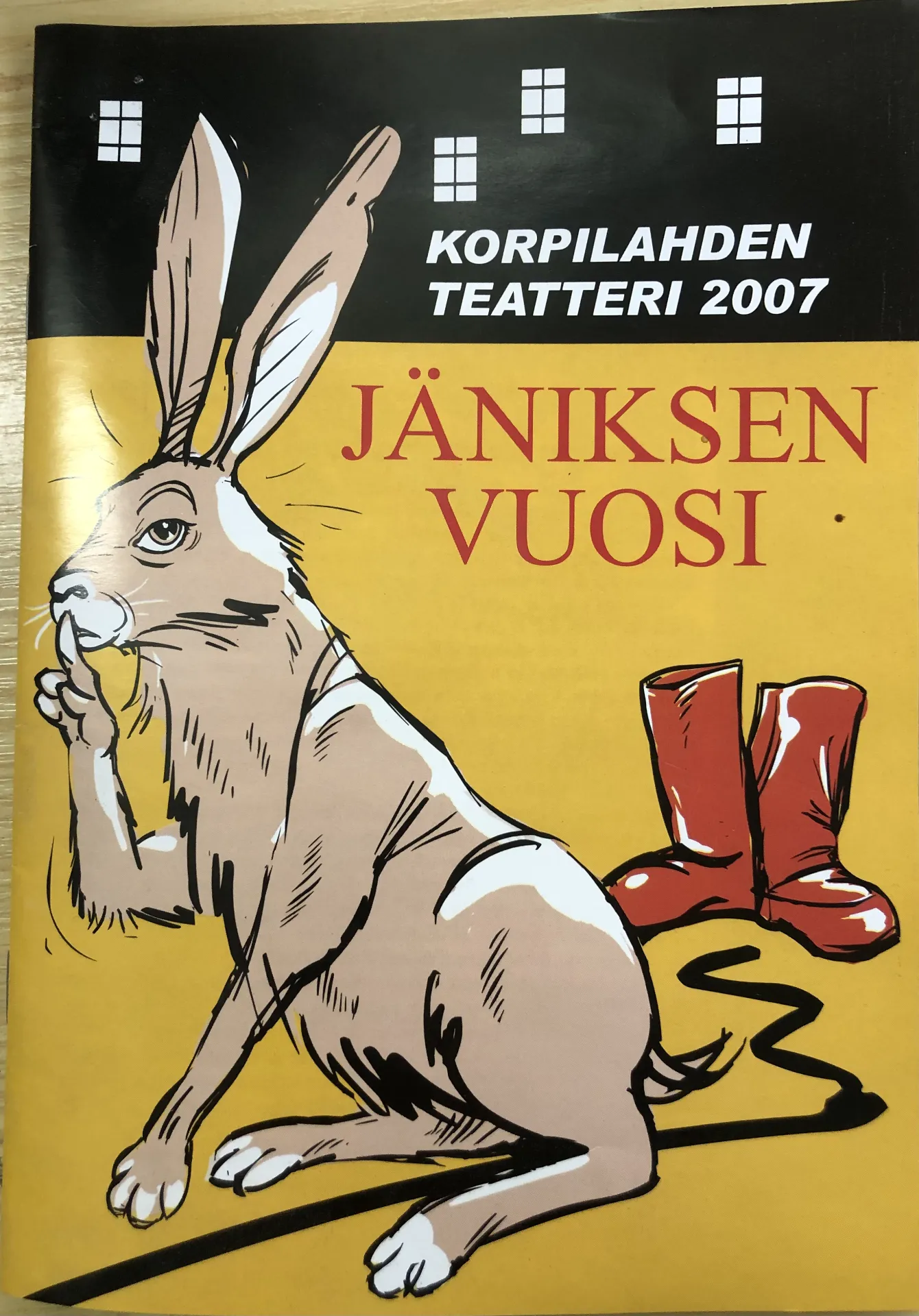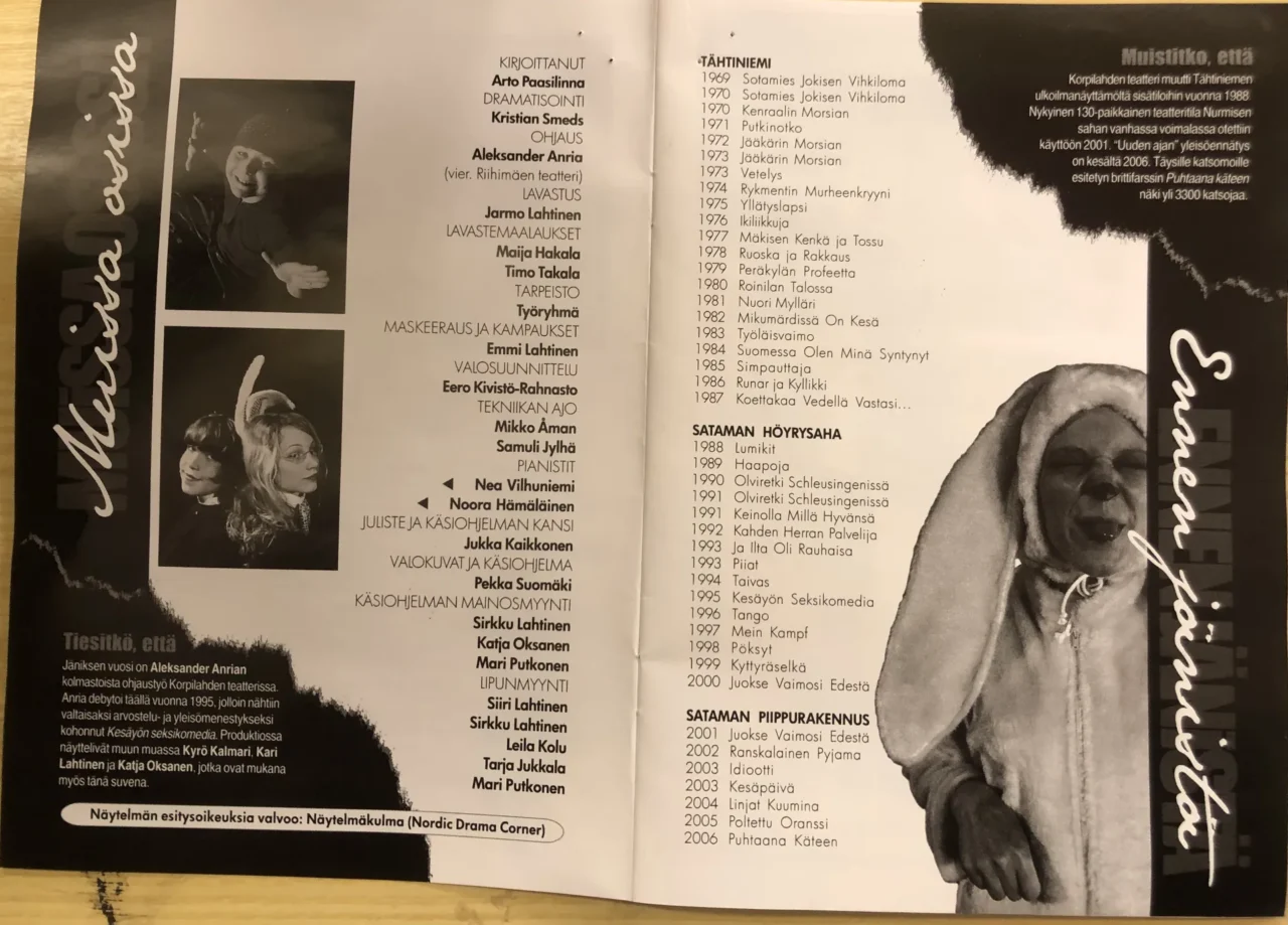 Jäniksen vuosi tunnetaan varmaan parhaiten 70-luvun filmatisoinnistaan. Korpilahdella turvaudutaan kuitenkin uudempaan, dramaturgi Kristian Smedsin 2005 kirjoittamaan versioon.