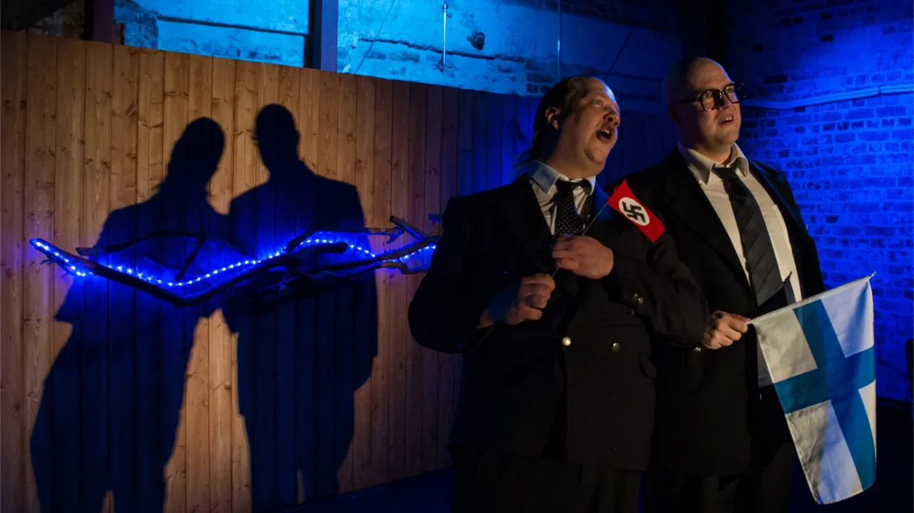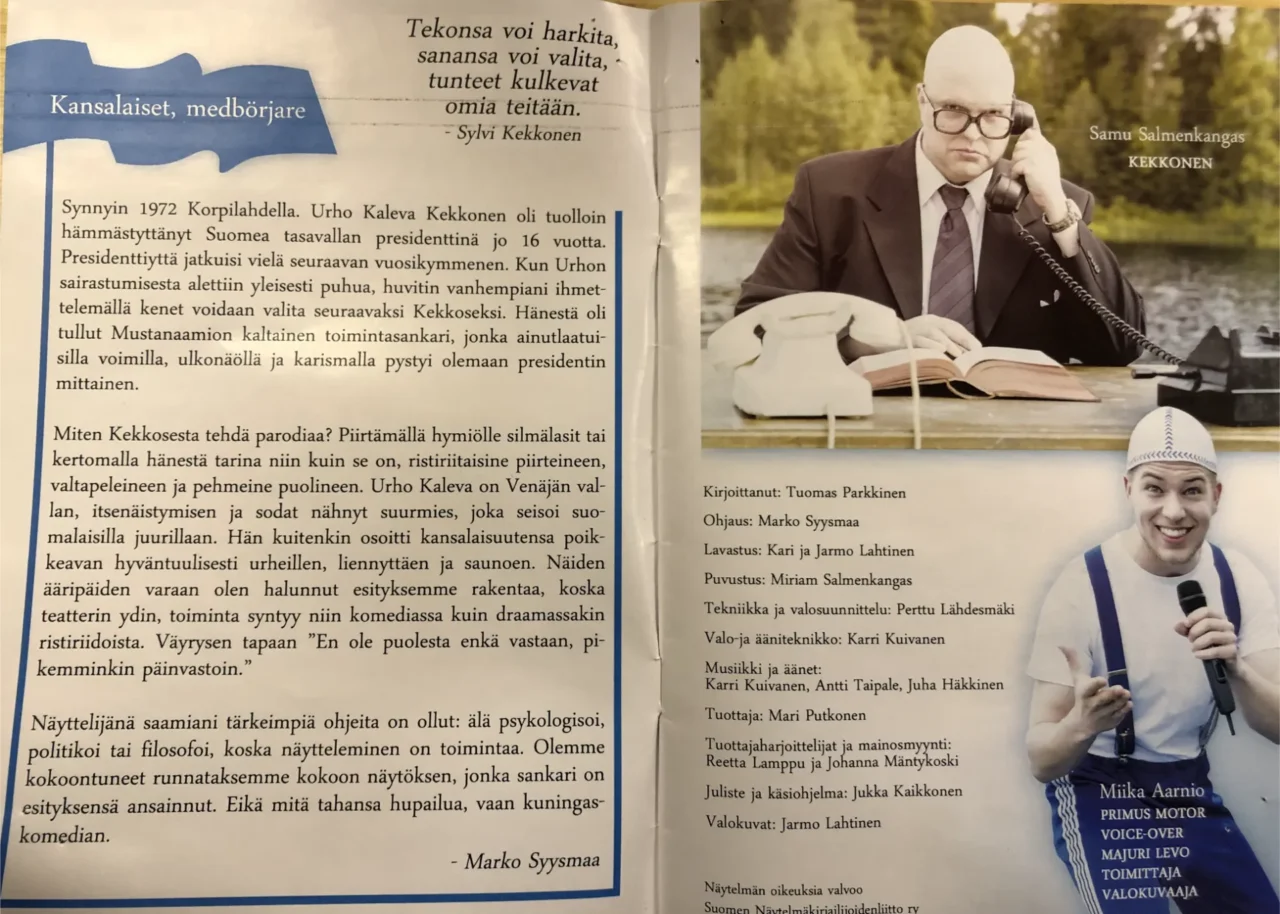 Näytelmä tuo eteesi komedian kirjon stand upista tilannekomiikkaan sekä politiikan vastapelurit Hrustsevista Hitleriin, Karjalaisesta Paasikiveen, tanhu-Väyrysestä hyllyviin alleihin.