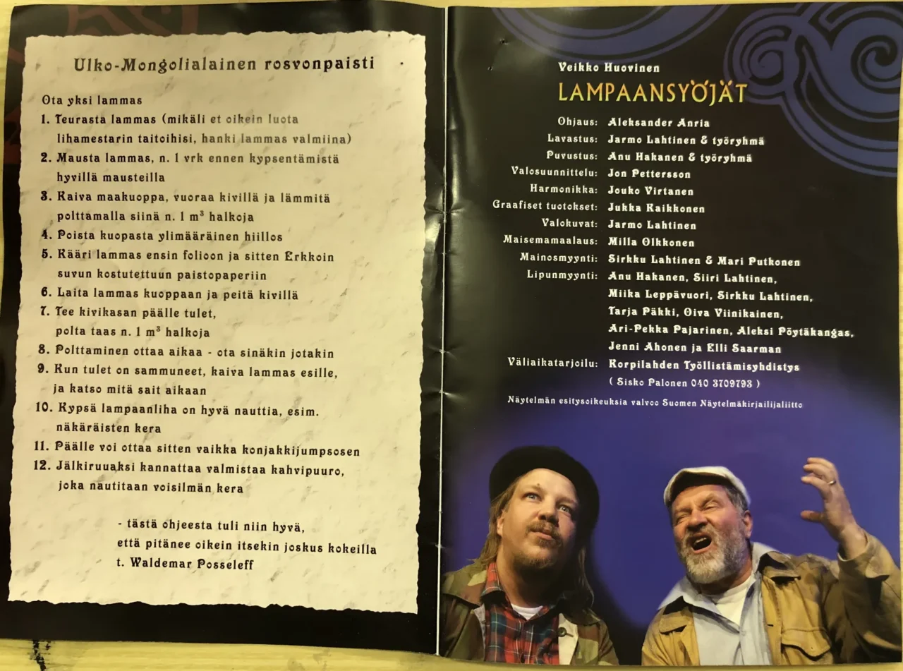 Se kertoo kahdesta miehestä, Sepestä ja Valtterista, jotka lähtevät elokuussa erikoiselle autoretkelle. Elokuvaversiona (1972) road movie -leiman saaneen tekstin kulmakiviä edustavat juopottelu, kulinarismi ja filosofointi. Lampaansyöjät ohjaa Aleksander Anria, joka palaa Korpilahdelle vuoden tauon jälkeen.
